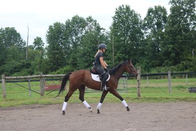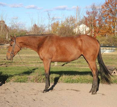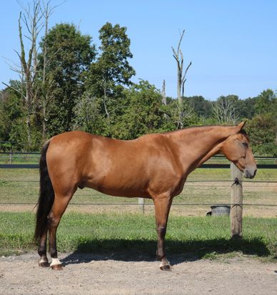 2020 Bay TB Mare. Fire stands at 16.1. She is sound with no known injuries or maintenance. She is up to date. Fire is turned out in a mixed herd and gets along well with others. She doesn’t crib, bite, kick, or weave. Fire has good ground manners and a sweet personality. She stands tied, clips, bathes, and is good for the vet/farrier. She is easy to catch and loves people. Fire loads and hauls well. Undersaddle, Fire is quiet and classy. She has a solid walk trot canter with cute movement. She has been started over fences and doesn’t mind filler. She is on the quieter side and very straightforward to ride. She will trail ride alone or in a group and crosses water, bridges, traffic. No vices undersaddle. She is junior/ammy friendly.